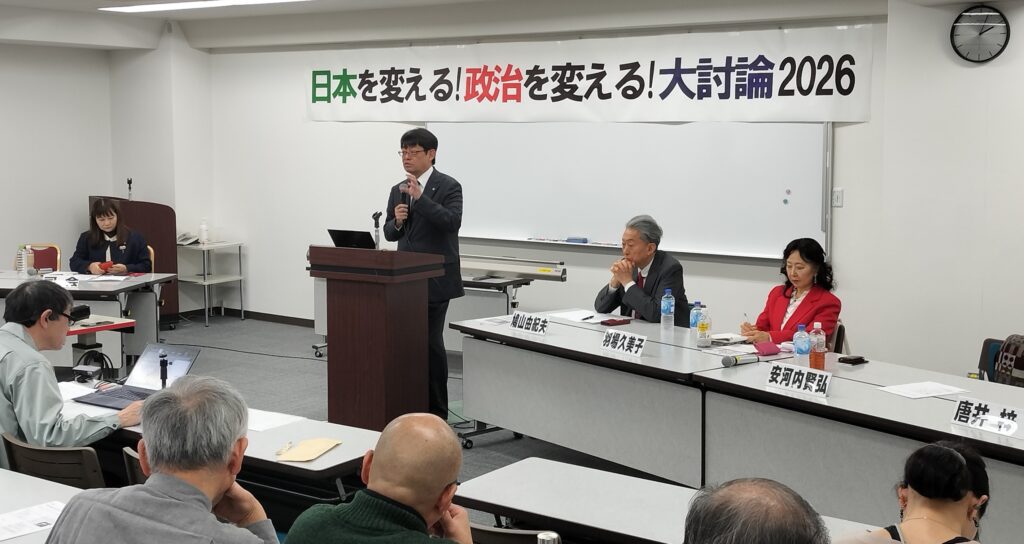 「日本を変える! 政治を変える! 大討論2026」が1月24日、東京で開かれた。今回の取り組みは2024年に次ぐもの。自主・平和・民主のための広範な国民連合を中心とする実行委員会が主催した。鳩山由紀夫元首相、安河内賢弘・JAM会長、羽場久美子・青山学院大学名誉教授、猿田佐世・新外交イニシアティブ代表、唐井梓・お茶の水女子大学大学院生が問題提起を行った。本来は高市首相の「存立危機事態」発言を受けて外交・安全保障問題をテーマに準備されたが、首相が解散・総選挙に打って出たため、討論では首相を退陣に追い込み中国との関係を修復することがより切迫した課題であることが意識され、熱気のある議論が展開された。また、外交・安全保障の課題と国民生活の課題が地続きのものとして議論され、労働運動や国民運動などの役割と重要性が確認される取り組みとなった。