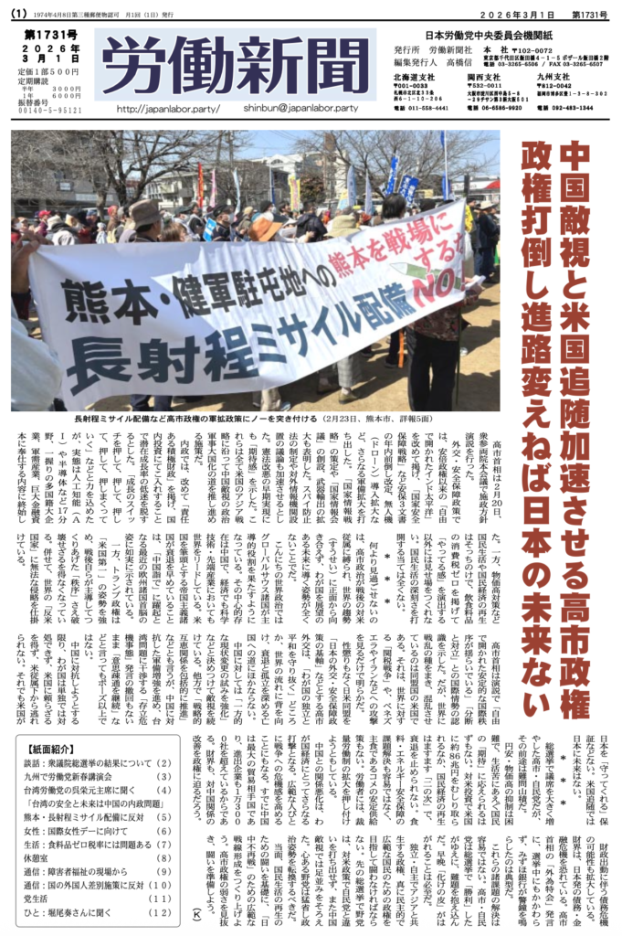 ・【声明】第51回衆議院議員総選挙に際して 中国敵視・国民犠牲の高市政権は「亡国への道」 野党が奮闘し退陣に追い込むよう呼びかける