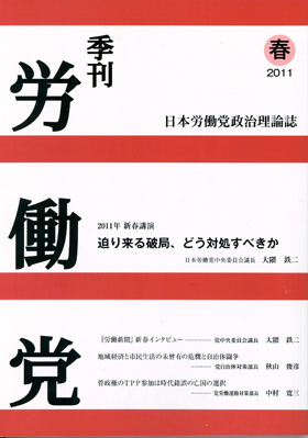 ◆内容 ■迫り来る破局、どう対処すべきか 2011年労働党新春講演会における講演(要旨) :日本労働党中央委員会議長 大隈 鉄二 □『労働新聞』新春インタビュー :日本労働党中央委員会議長 大隈 鉄二 □地域経済と市民生活の未曾有の危機と自治体闘争 ーー名古屋市長選挙が示した自治体と地方選挙の喫緊の争 点 :党自治体対策部長 秋山 俊彦 ■菅政権のTPP参加は時代錯誤の亡国の選択 独立・自主の旗を高く掲げ、広範な国民各層を率いて、アジアと共生する進路を切り開こう :党労働運動対策部長 中村 寛三