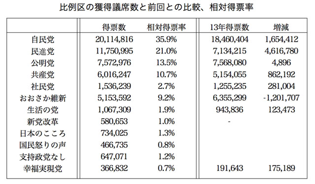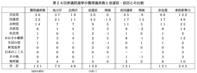 五十六議席(選挙区三十七、比例区十九。追加公認を含む)を獲得、改選議席数から六議席増えたが、前回比で九議席少ない。非改選議席とその後の入党者を合わせ、参議院で百二十二議席となった。比例区得票数は(表)の通り(以下同)。