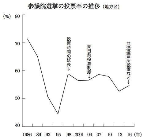だが、二〇一三年の参議院選挙と比べれば、自民党は九議席少なく、民進党(民主党)は十五議席多い。自民党の比例区得票率は三五・九%で、前回比一・二ポイント減っている。勝利した選挙区一人区でも、群馬・奈良・和歌山・香川など七県で得票数を減らしている。同じく三議席増えた公明党の得票率も、〇・七ポイント減(一三・五%)である。